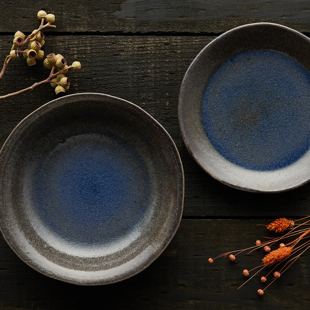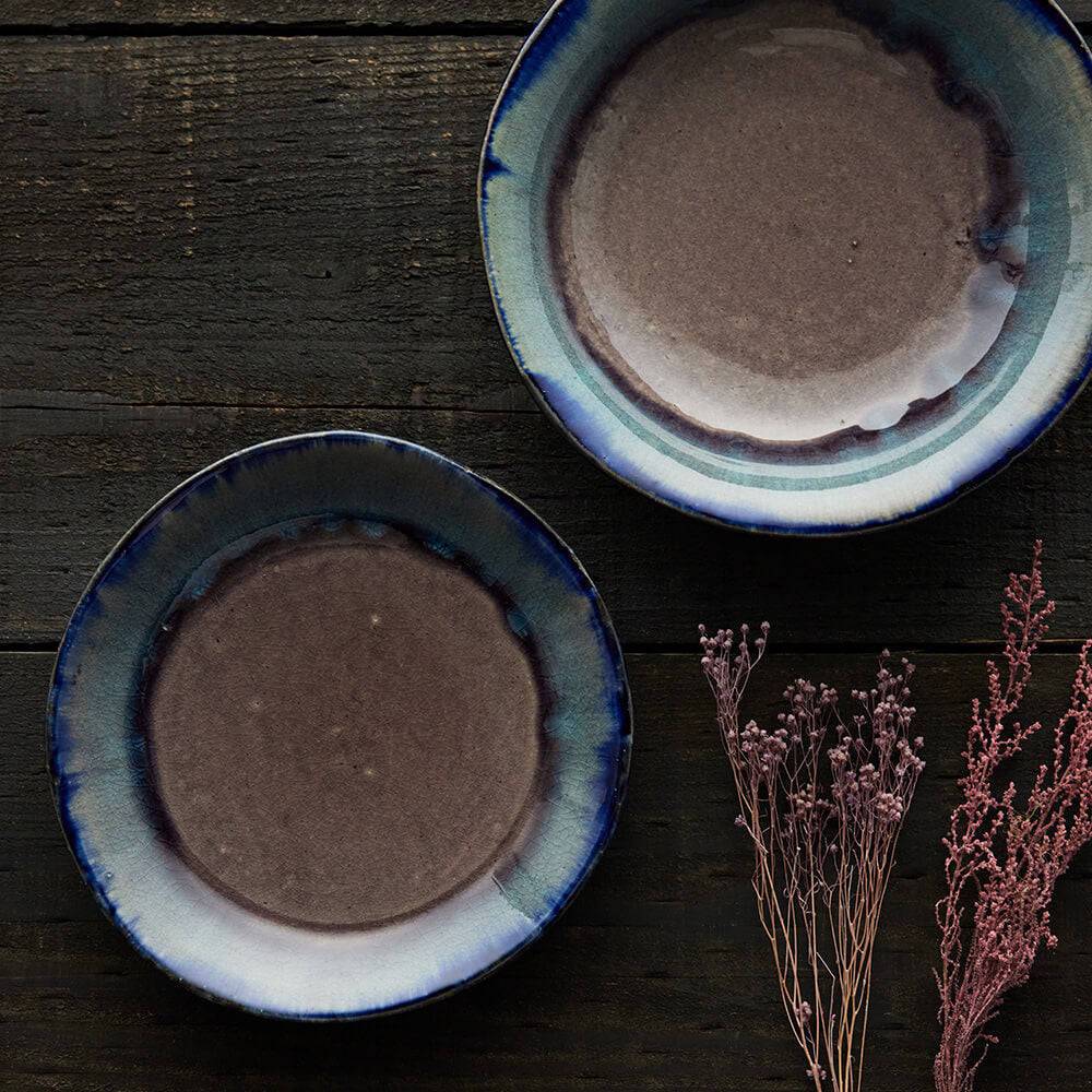「弥」は、いよいよ、ますます(程度が進むこと)を表し、「生」は生い茂るという意味。縁の濃い青に冬の名残を感じつつ、春が近づいてくる。生命の息吹。そんな生命力を感じる季節を数色のブルー系の釉薬を掛け分け淵から中へと流れ落ちていく釉調のグラデーションで表現。