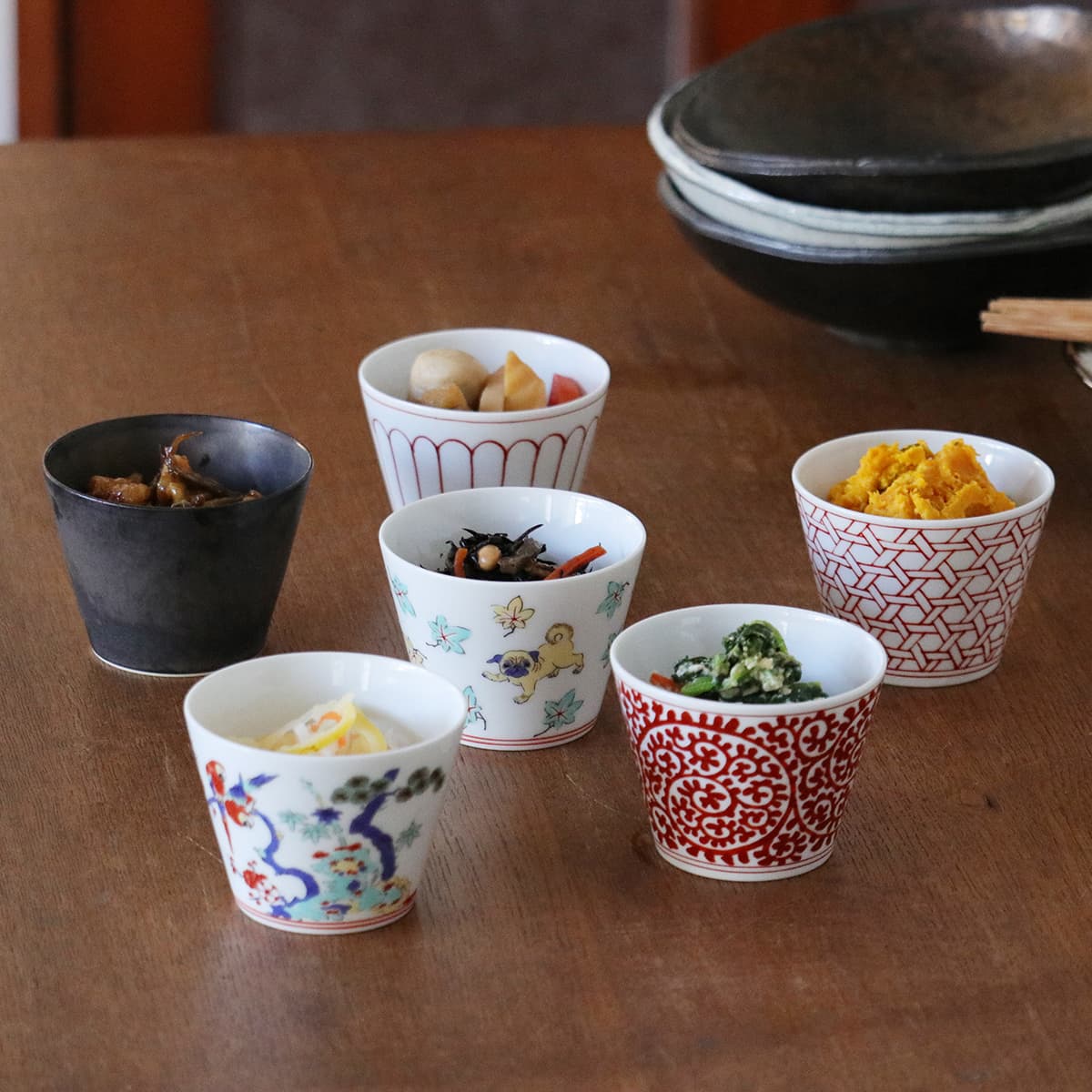 江戸時代にそば猪口が大流行し、豊富なデザインが生み出されました。その中でも繰り返し描かれている縁起の良い文様を5種類厳選したそばちょこです。そばを入れるだけでなく、和え物やデザートを入れたり、湯のみとして使うこともできます。