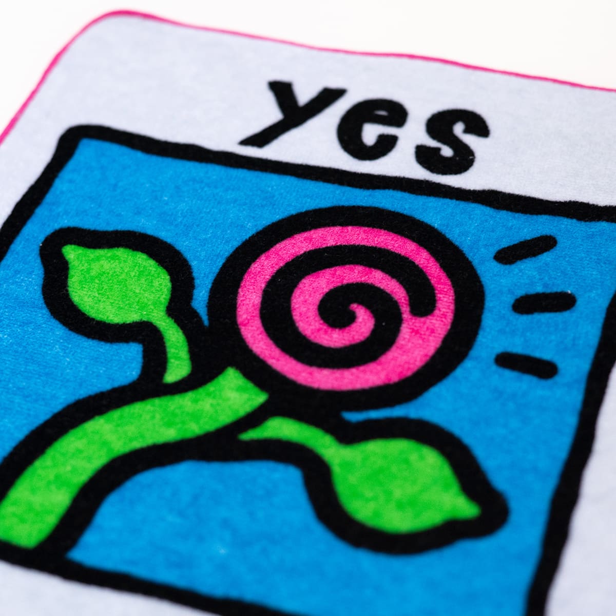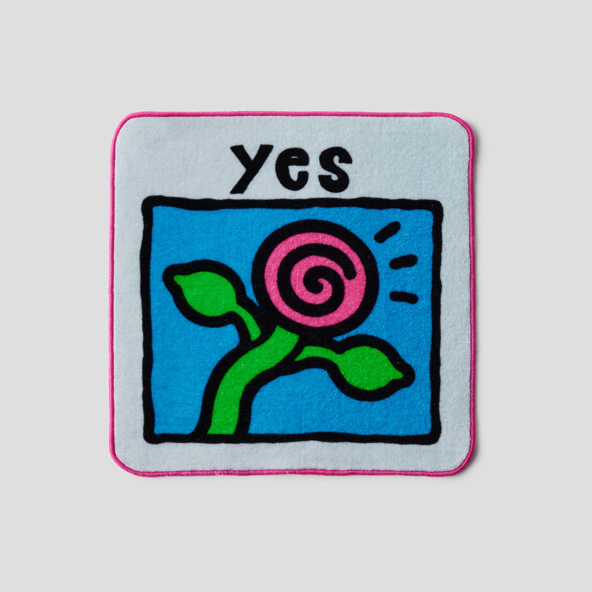 イラストレーターの5eLさんが描き下ろしたデザインのタオルハンカチ。特徴的なバラのイラストと大きな「yes」の文字は、何かに迷ったときにそっと背中を押してくれそう。