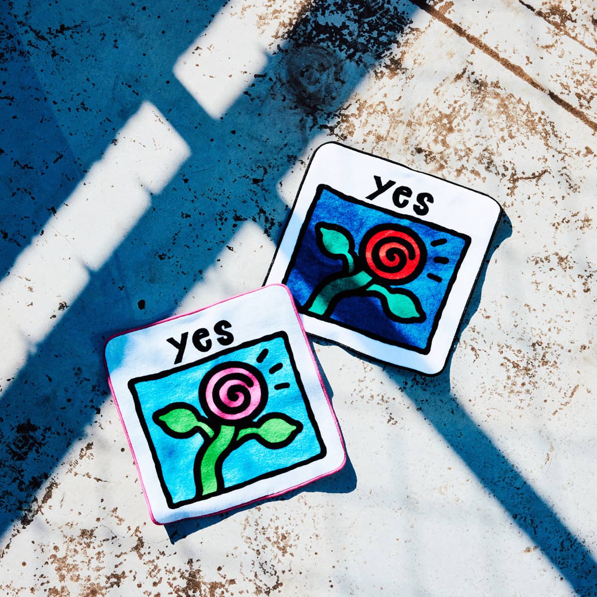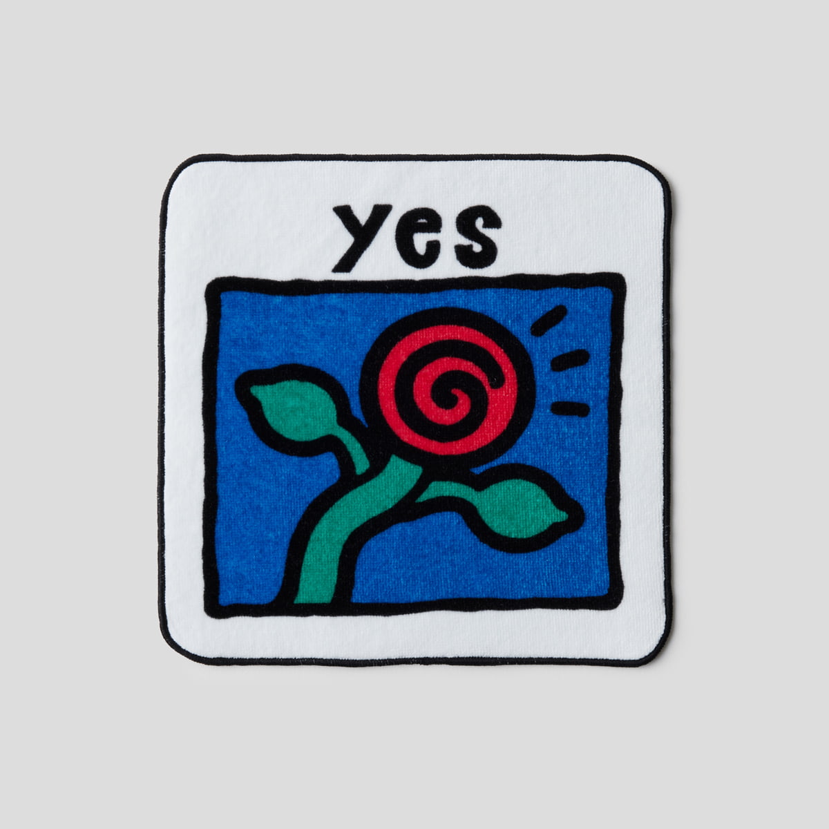 イラストレーターの5eLさんが描き下ろしたデザインのタオルハンカチ。特徴的なバラのイラストと大きな「yes」の文字は、何かに迷ったときにそっと背中を押してくれそう。