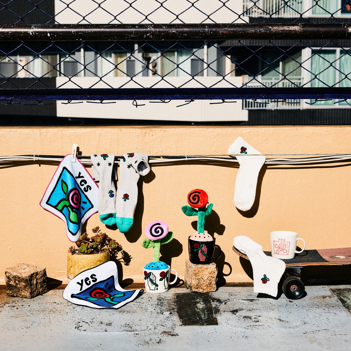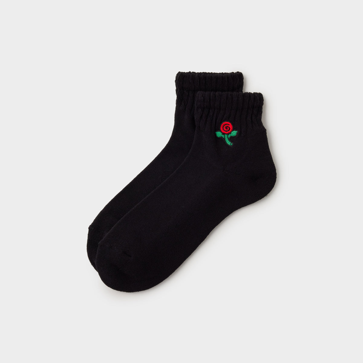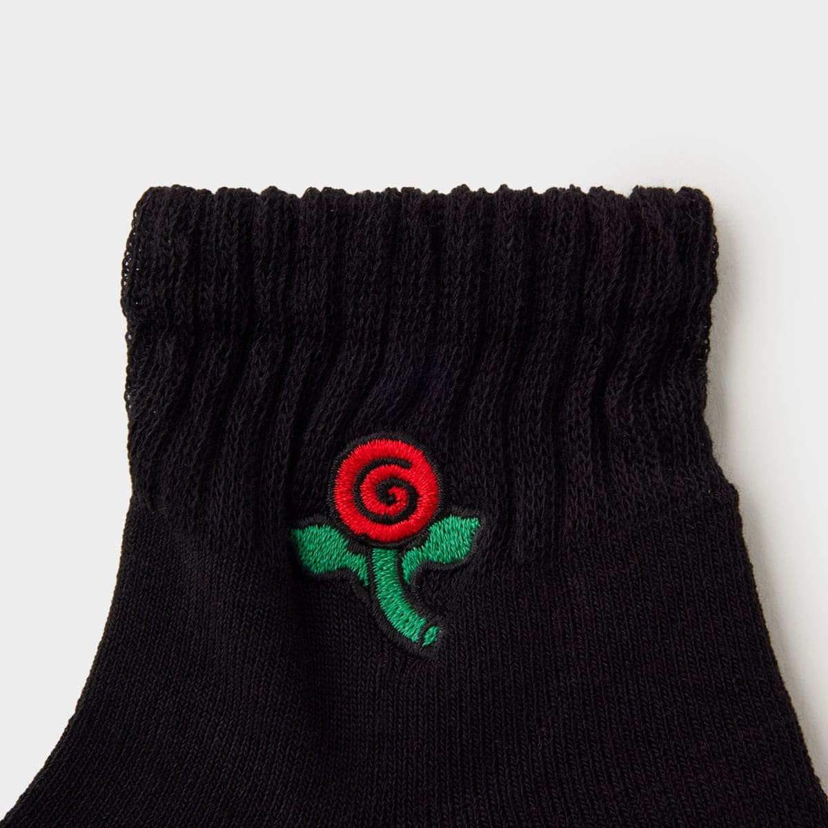 イラストレーターの5eLさんが描き下ろしたデザインのショートソックス。イラストの輪郭がハッキリして、控えめなサイズ感ながらもしっかり主張してくれています。さり気なく、でも確かに存在するバラが足元のスパイスに。