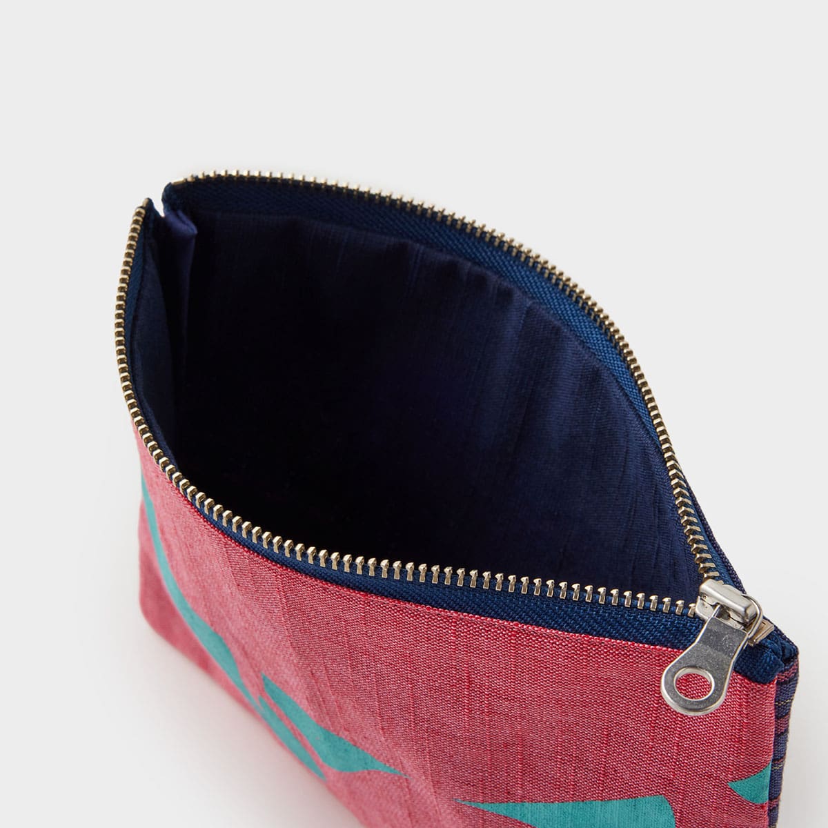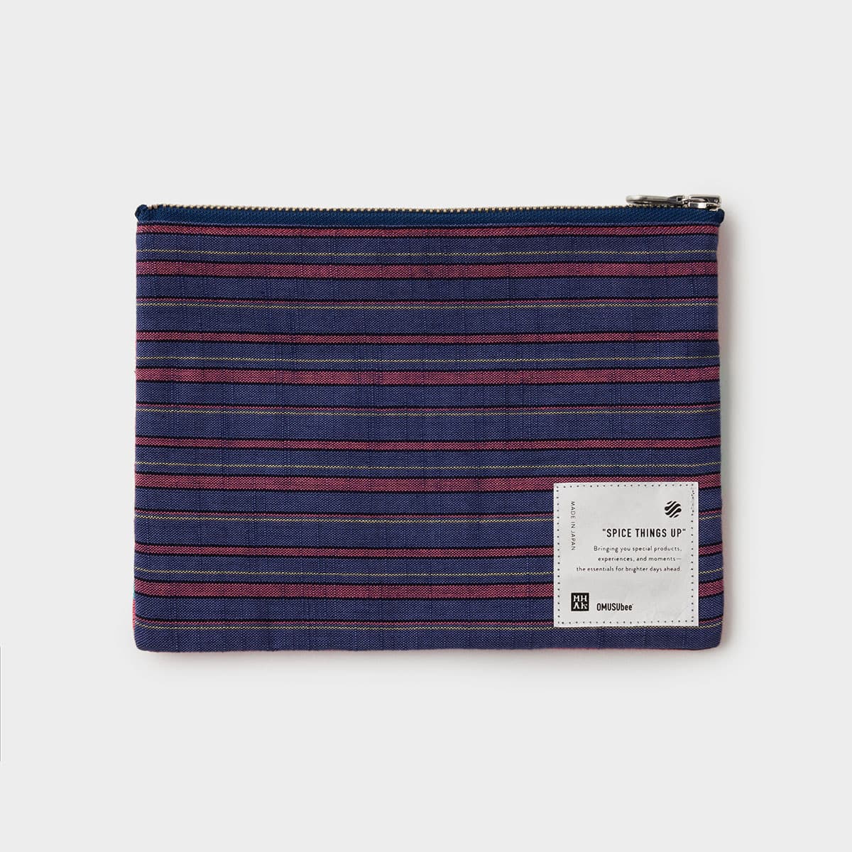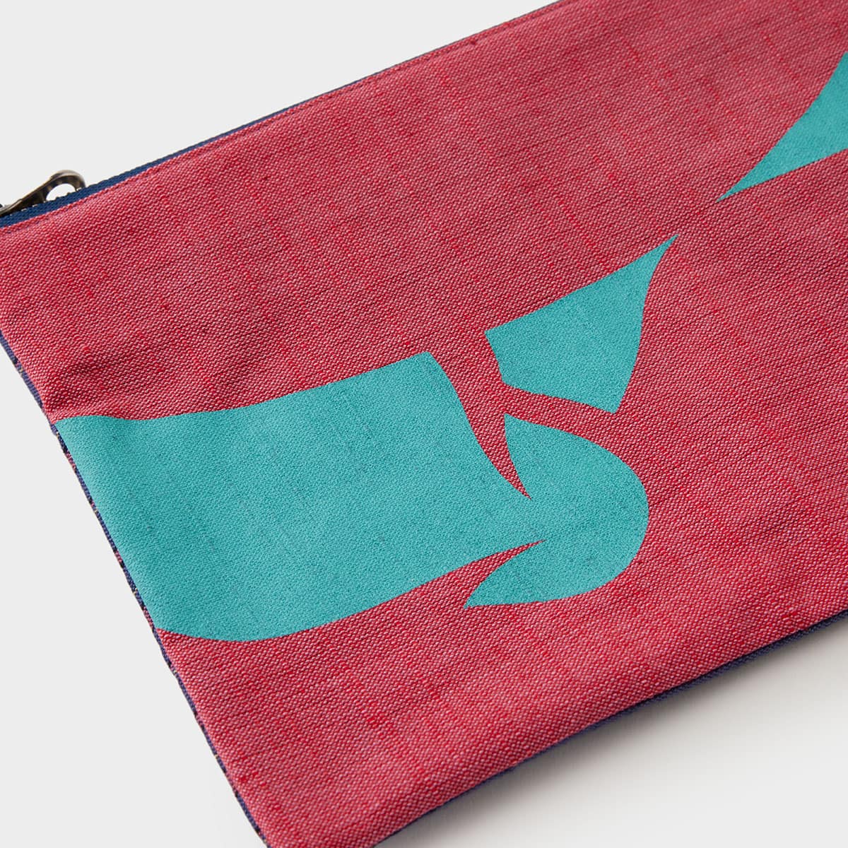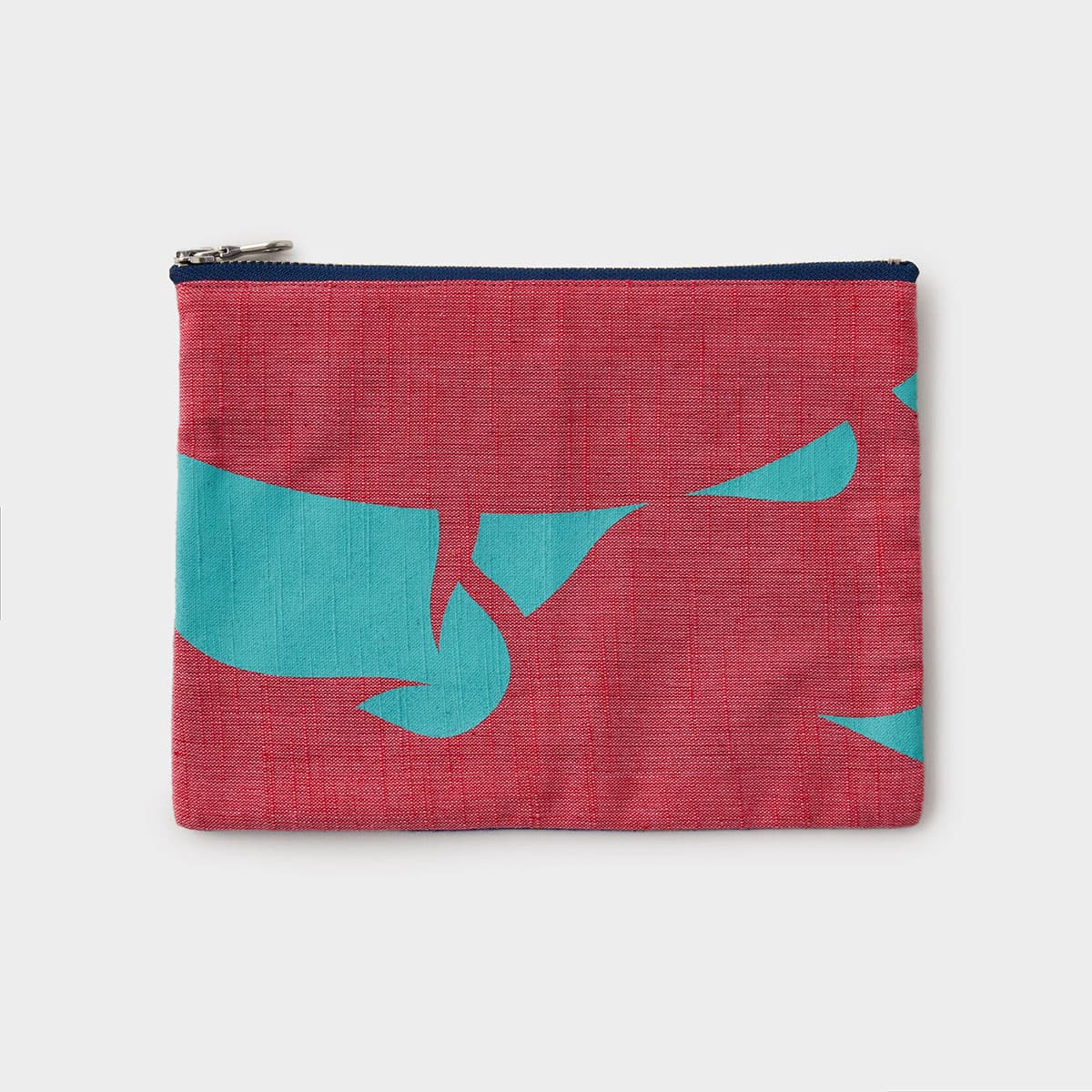 ペインターのMHAKさんによるデザインの会津木綿のポーチ。前後でガラッと印象が違うデザインが見て楽しいアイテム。マチの無い薄型のポーチはかさばらないので、バッグインバッグとしても重宝します!