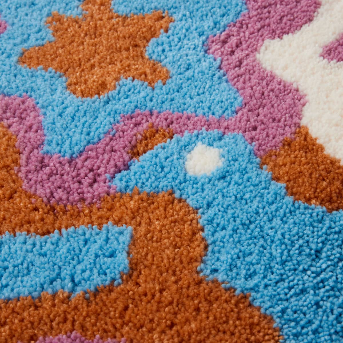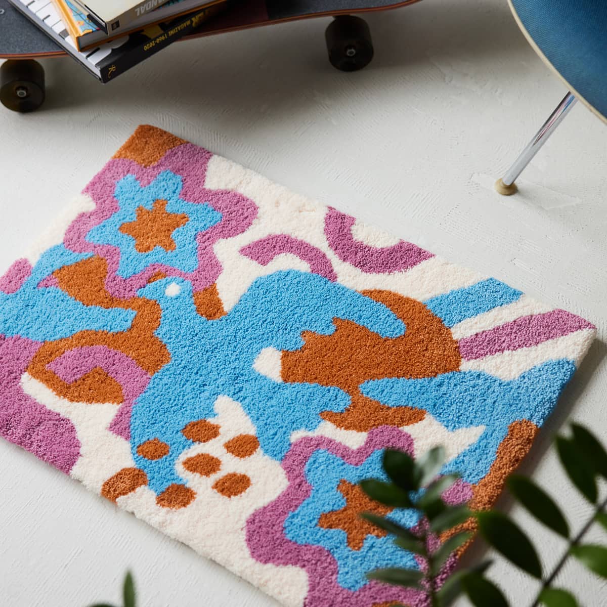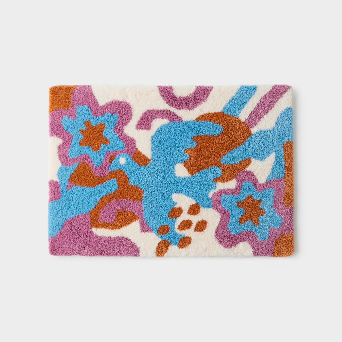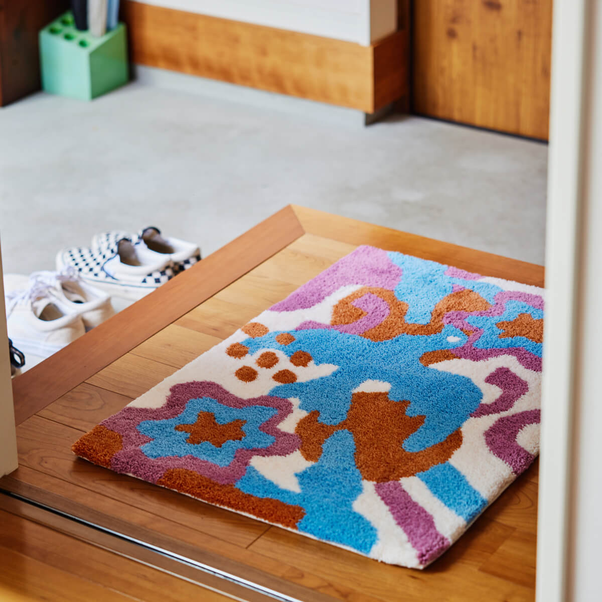 アーティストのToyamegさんがデザインしたラグマット。まるで朝焼けのようなピンク色の空に、爽やかな青色の鳥が舞っているようなデザイン。ぜひお気に入りのスポットに敷いてお楽しみください。